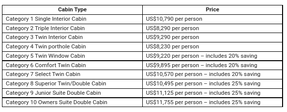 | Category 3 Twin Interior | US $8,290 per person | US $8,290 per person |
