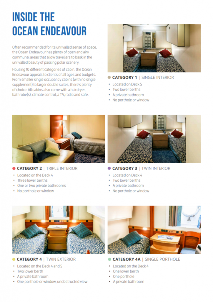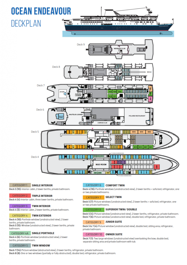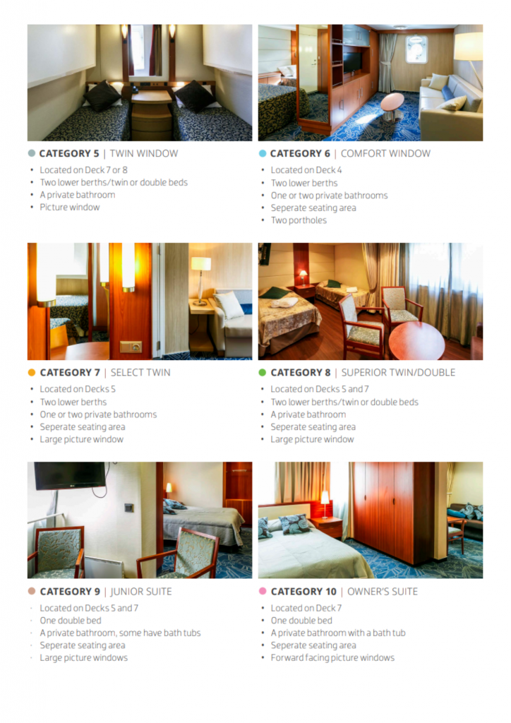 | Category 6 Comfort Twin | US $11,190 per person | US $8,950 per person |
