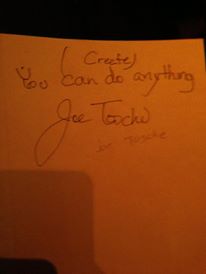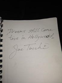 I walked up to the first person and asked him if he would write something in my journal. Without hesitation he immediately wrote in perfect cursive, “Dreams Still Come True in Hollywood.” I was so touched that I offered him the only other singles I had left, smacked my friend excitedly instructing them to go get more singles, and marched off to find my next interview.