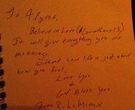 Next was a guy named Steve who I met because I’m psychic, and knew he was from the same hometown area as me, West Palm Beach, where he used to run a dance studio before it went bankrupt. He came to LA to continue his dream of teaching dance while being aided by the VA Hospital, but when it lost funding for housing, he was left on the streets. He was very passionate about life in his conversation and in his entry, “To Alyssa, Believe in love. It will give everything you do meaning. Without love life is just about how you feel. Love ya & God bless you.” When I looked closely at the numbers he was writing under his entry, I realized it was his social security number, to which he told me that if we ever wanted to find him, we could ask the VA to look him up by his social.