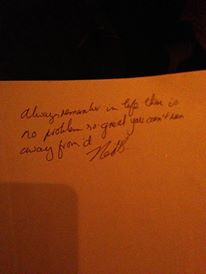The next guy’s entry I can’t really tell if it’s cynical or influential, however I will still note that his handwriting is also in nice cursive. Neil wrote, “Always remember in life there is no problem so great you can’t run away from it.” So I’m assuming he ran away from something…and it didn’t end well.