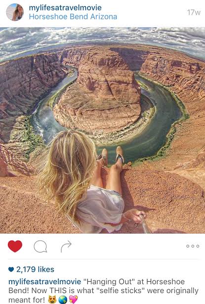 I specifically went to Horseshoe Bend because I really, really wanted this shot. Again, notice how you donโt see my left arm, and Iโm looking down; itโs because I can see the preview of the GoPro shot on my phone, which I was purposely angling so you couldnโt see the dozens of tourists staring at me like I was crazy for hanging my feet over the edge to take a โselfieโ. To be fair, I was slightly terrified, and I did fit in with all of the tourists using selfie sticks for their phones. My travel companion was slowly starting to hate me for taking photos instead of โenjoying the momentโ.