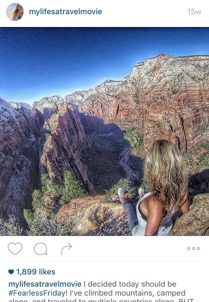 Angelโs Landing is the highest/hardest hike in Zion National Parkโฆguess who didnโt know that until they were half way into the hike? I was not prepared at all. Also guess who had never climbed a freaking mountain using mounted chains and ropes? This girl. That being said, you can probably imagine why my hair (which I only took down out of a bun for the pic) is wet. I also waited about 10 minutes for a guy to hike down so he wouldnโt judge me for using a selfie stick. On a cooler note, two girls stopped me at the top because they follow me on Instagram! #humblebrag.