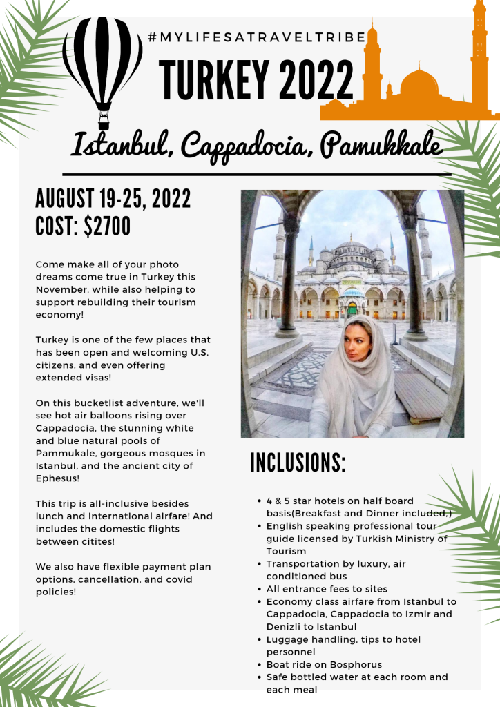 Join us for our second group trip to Turkey in August 2022! Next year we will be adding in the option to do the flying dress photoshoot on the second morning in Cappadocia (additional $200), and a traditional hammam!