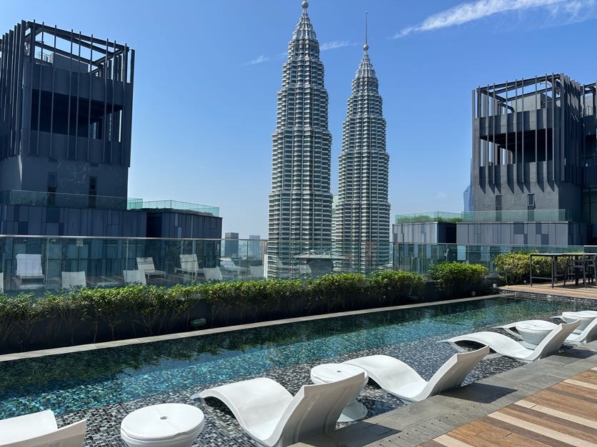 I found the most incredible apartment on Booking for about $70 per night. It’s in a brand new, chic, fifty story building, with an incredible rooftop pool with a prime view of the Patronas Towers!