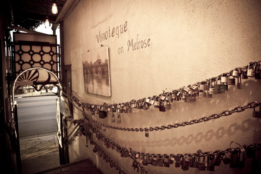 Unless you’re a Melrose neighborhood local, or an extremely keen eyed pedestrian, chances are you haven’t heard of Vinoteque on Melrose. I myself found this fabulously quaint wine restaurant while walking my dog who pulled me into the narrow alleyway lined with “love locks” that leads into a charismatic patio surrounded by four, two-story buildings.
