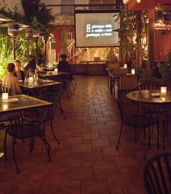 Green foliage covers the brick wall on the left, and herbs, vegetables, and flowers grow in the wooden troths below it. The brick floor and black lattice metal patio furniture gives Vintoeque a Parisian vibe, and the old black and white classic movies that are projected on the back wall enhance the romantic ambience. The open air patio is referred to as their #urbanoasis aka their open-air-herb-lined-patio, a true sanctuary in the heart of Hollywood.
